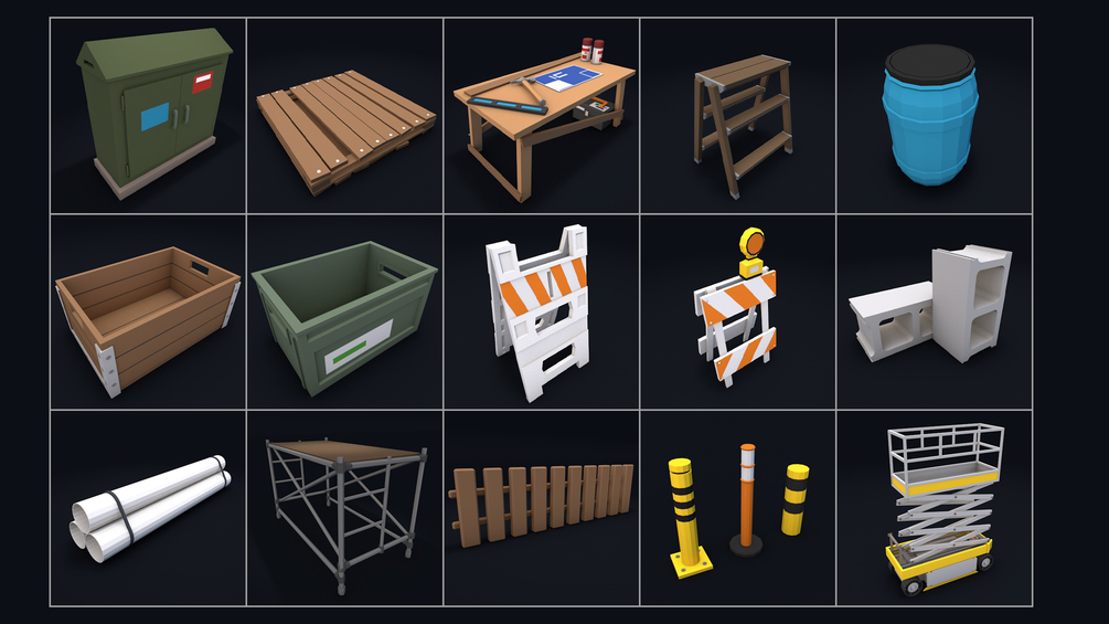 Crane Crawler, Road Roller, Excavator, Bulldozer, Truck Cement, Truck Dump, Forklift, Recycling Dumpster, Surveying Tripod, Cement Mixer, Crane Lift, Light Portable, Cointaineer House, Load Cart, Crane, Barrle, Crate, Trash bin, Ladder, Metal Box, Container, Transformer, Scaffold, Skip Large, Water Tank, Generator, Power Box, Wirespool, Wooden Box, Barrier, Fire hydrant, Cinder Block, Drainage Pipes, Barrier Plastic, Skip Bin, WOrk Bench, Road Cone, Palette, Wheel Barrow, Formwork, Construction Drainage